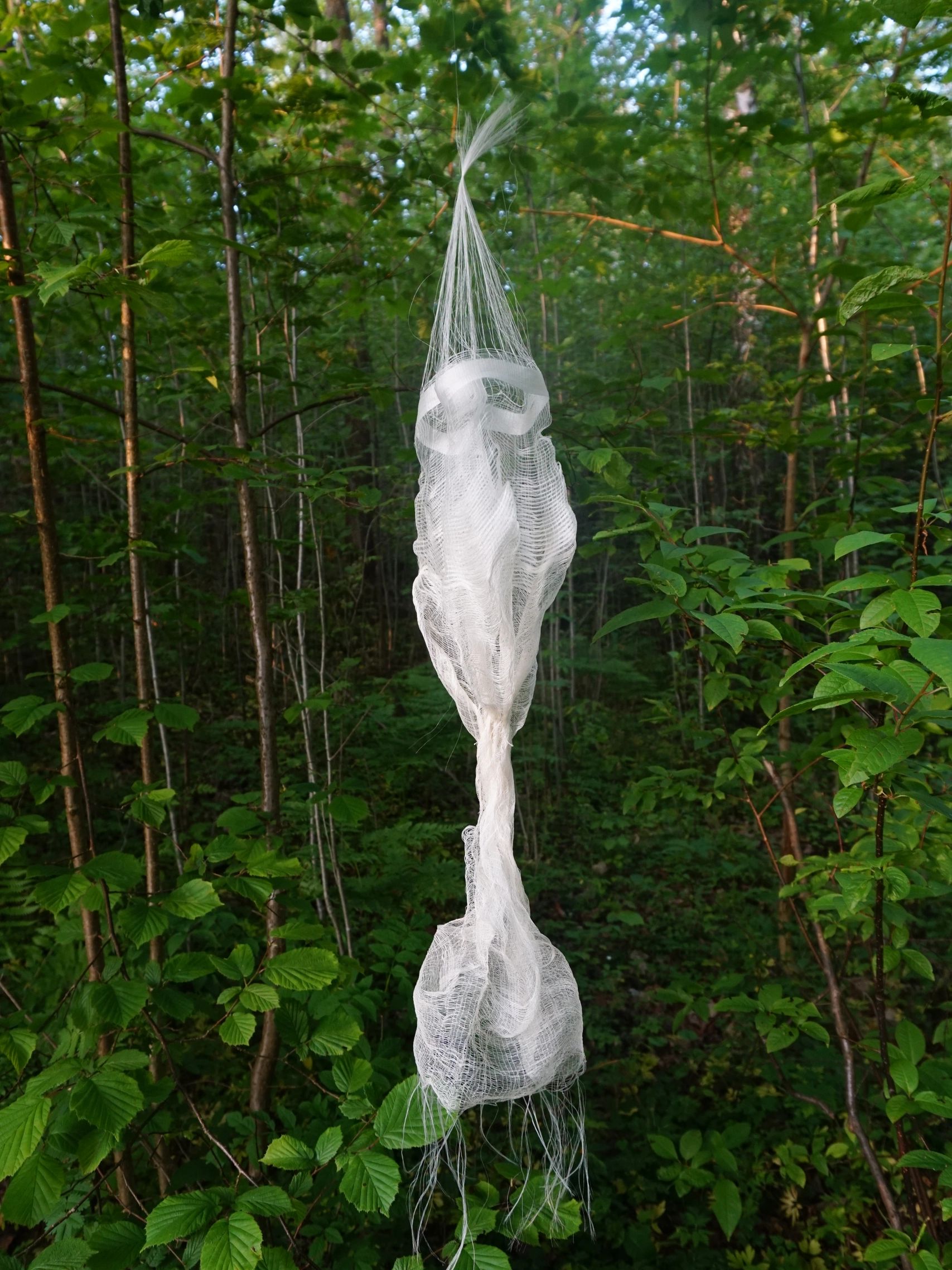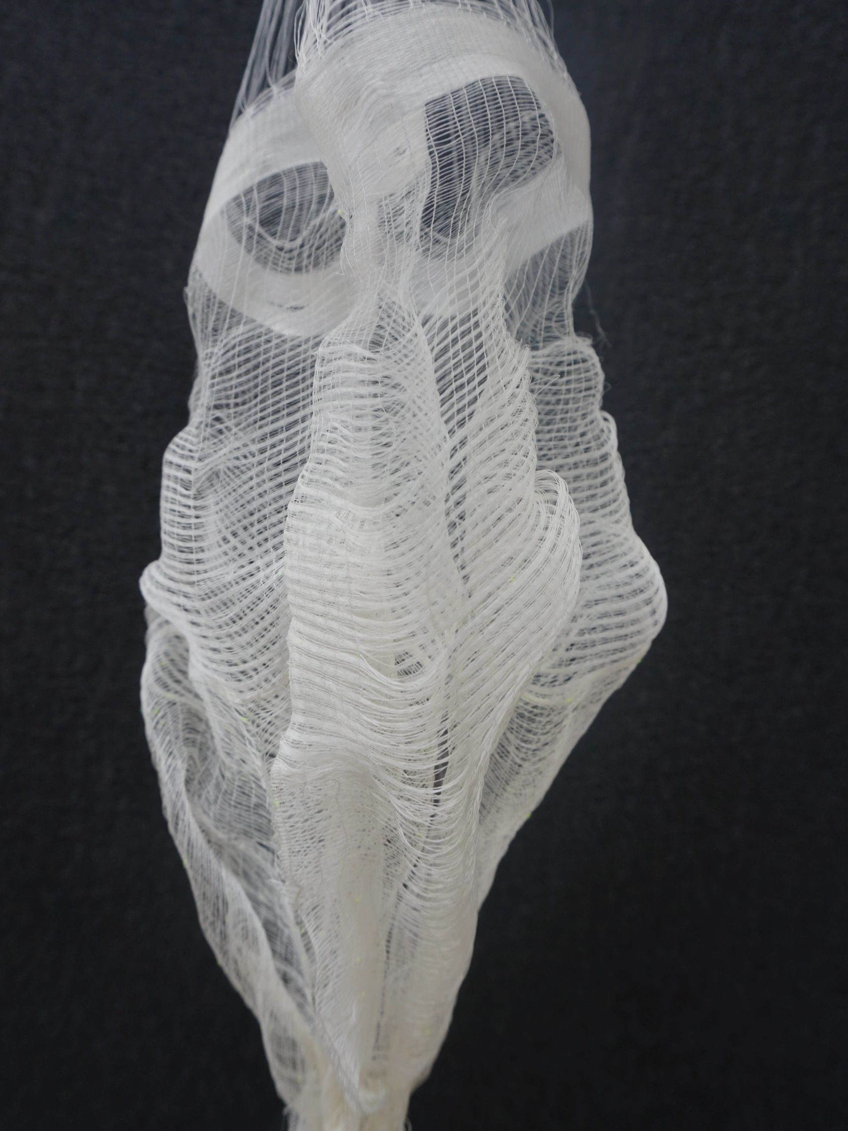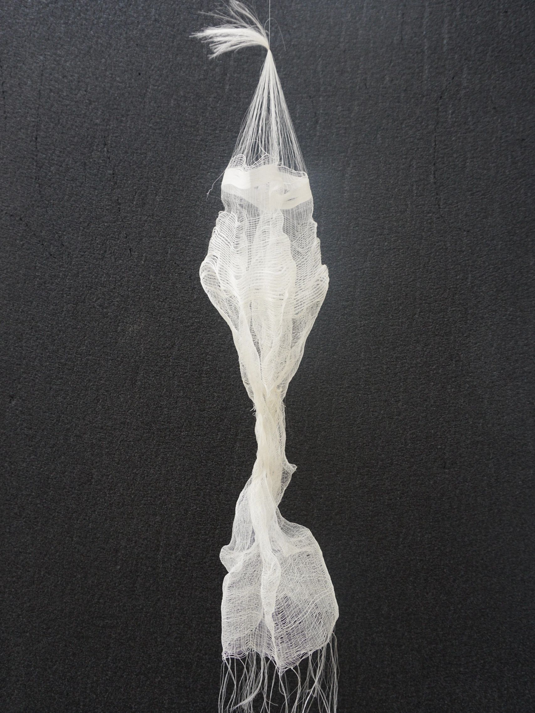 The "Pleating" investigates how high-twist silk responds to changing warp densities in leno weaving using a rail reed. Variations in spacing allowed the yarns to release stored stress, producing spontaneous spiraling pleats rather than the planned expansion. The widest section showed the strongest pleating potential, transforming from a flat surface into a pleated form through gravity and gentle activation.