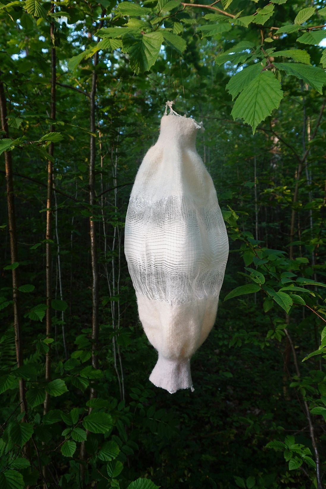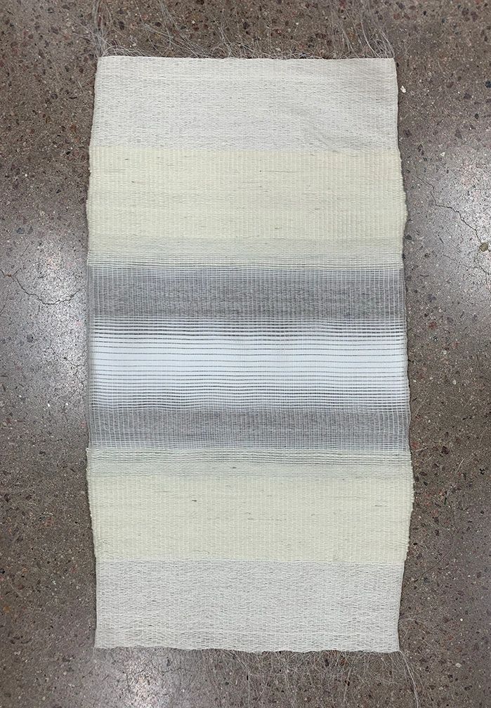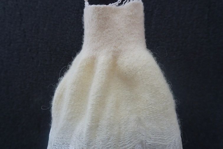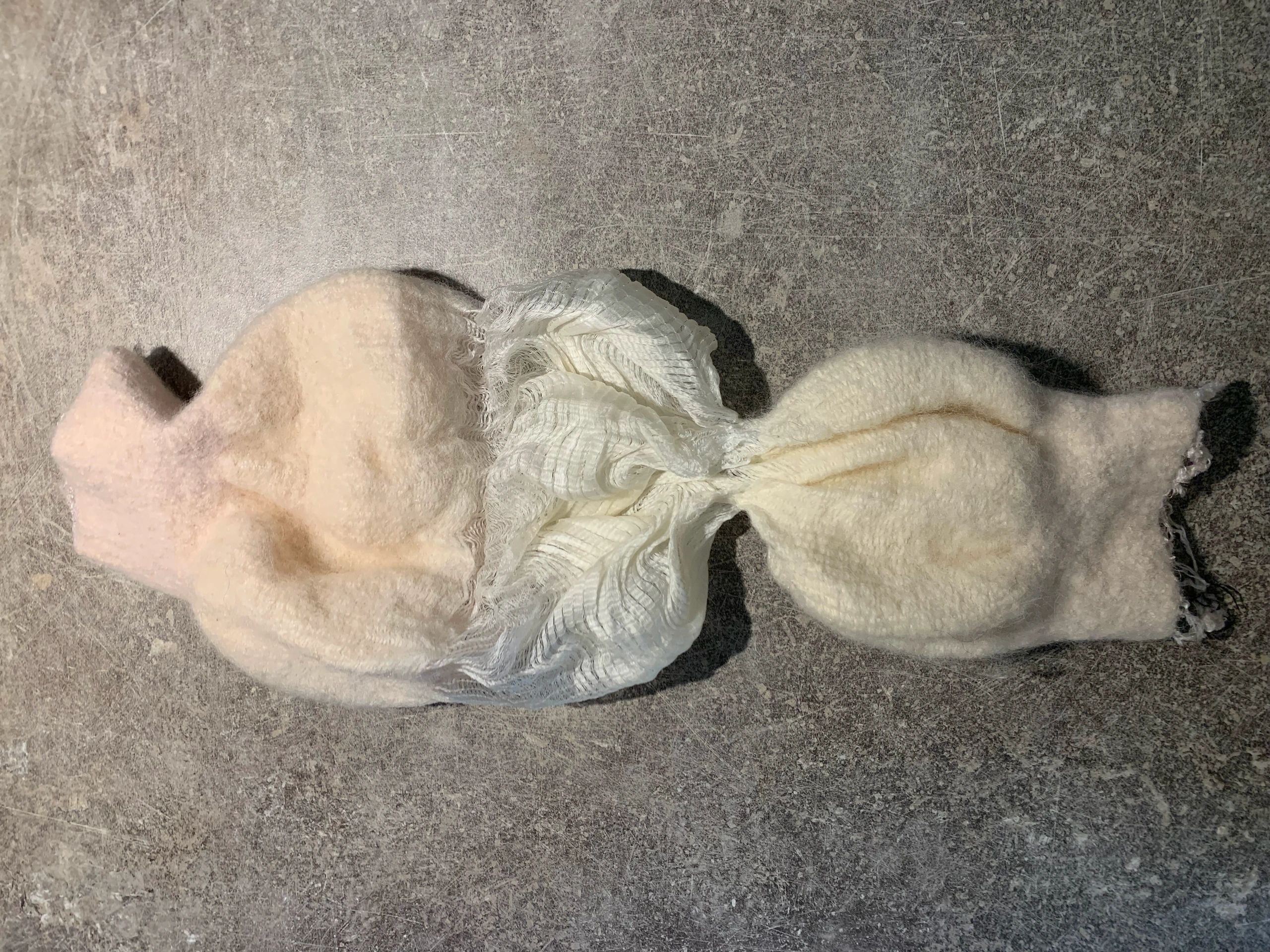 The " Shrinking" combines silk and wool, activating wool’s felting and shrinkage alongside silk’s stiffness, luster, and smoothness. Anti-water shibori techniques applied during washing allow the wool to shrink while preserving silk’s properties, generating a three-dimensional form through contrasting expansion and contraction